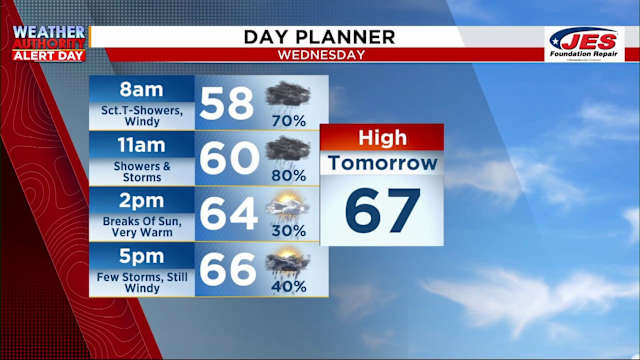 Storms will move in early this afternoon. All zones are under a marginal risk (1/5) for severe weather.