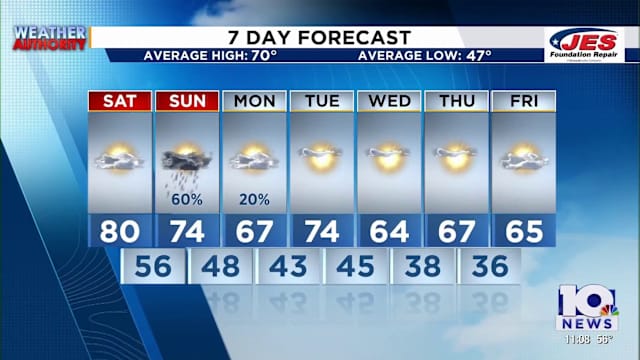 Read full article: Pleasant weather rules today, but weโre bracing for heavy rain and storms soonThe average last freeze for the New River Valley and Highlands regions is later, either late April and early May. Average last freeze (4/11/2020) (WSLS)After the cold start, we expect relatively tranquil weather conditions across southwest Virginia. Rain will develop through the day tomorrow and it could become heavy at times tomorrow night. Sunday night's storm threats (4/11/2020) (WSLS)Storms will linger into Monday morning, but weโll eventually dry out, warm up, and see the wind pick up by the afternoon. Behind a cold front, look for cooler and mostly quiet weather for the rest of the work week, save for a shower chance on Wednesday.