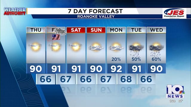 Read full article: An unstable pattern settles in for the rest of the weekDangerous heat and humidity continue in Southwest and Central Virginia, with thunderstorms expected and a cooler pattern on the way. Get the latest forecast from Meteorologist Delaney Wills and the 10 News Weather Authority team.